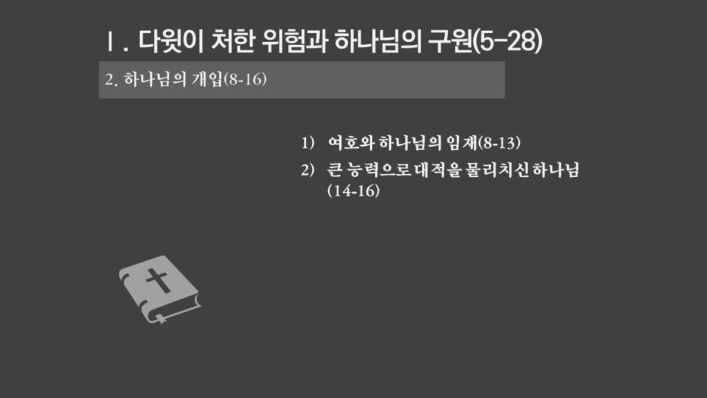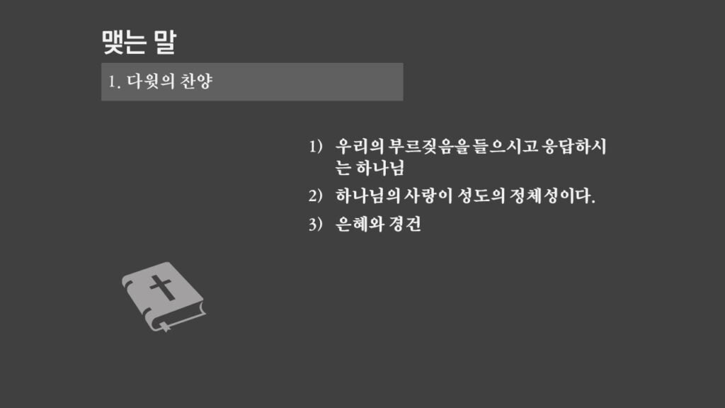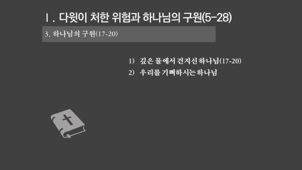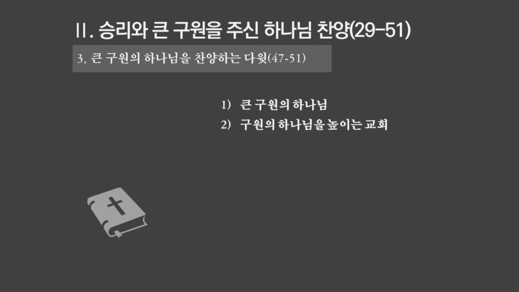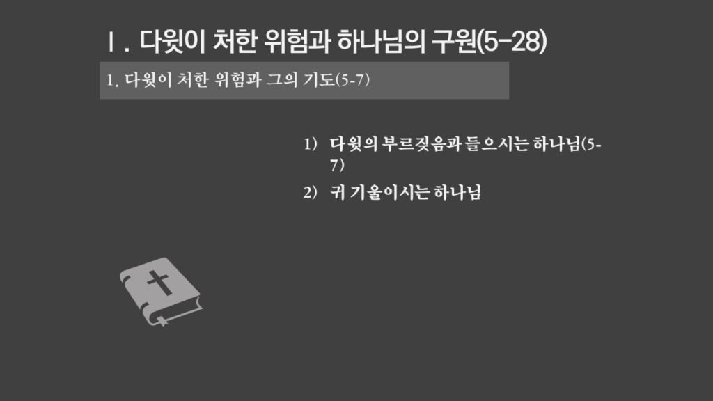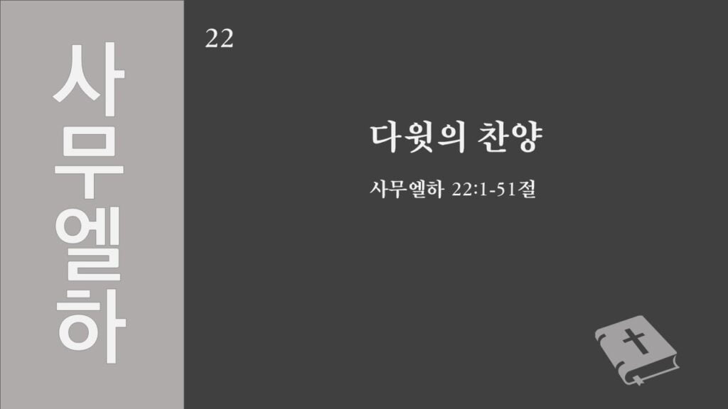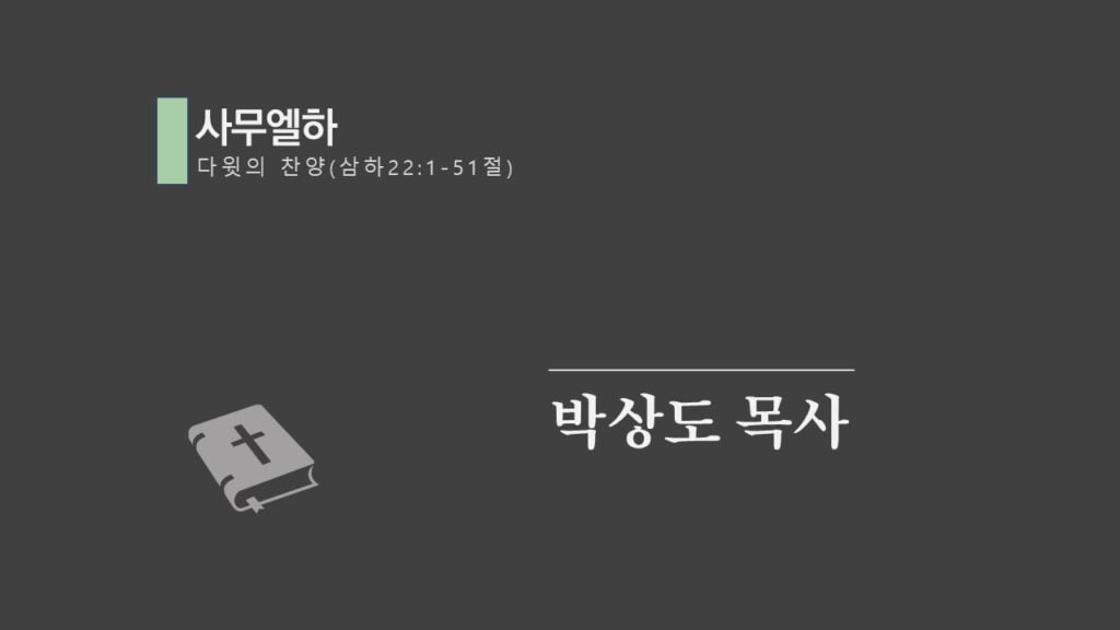 주일설교[사무엘하22] 다윗의 찬양 제목 : 다윗의 찬양 성경 : 사무엘하 22장 1-51절 설교 : 박상도 목사 https://sheffieldkoreanchurch.org/wps/wp-content/uploads/2021/10/211017_sermon.mp3 PrevPrevious[마태복음] 말씀에 반응하자 Next[사무엘하23] 다윗의 마지막 말과 용사들Next연관설교 [사무엘하24] 인구조사와 재앙 그리고 회개 31/10/2021 [사무엘하23] 다윗의 마지막 말과 용사들 24/10/2021 [사무엘하21] 그 후에야 기도를 들으시니라 03/10/2021 [사무엘하20] 세바의 반란 26/09/2021 [사무엘하19] 다윗 왕의 귀환 12/09/2021