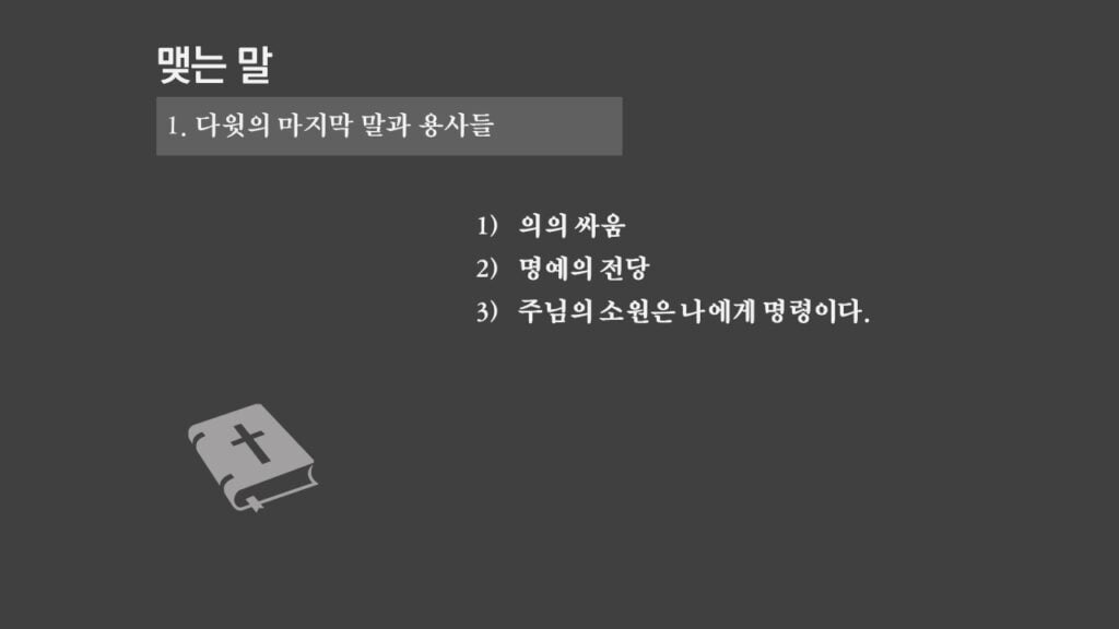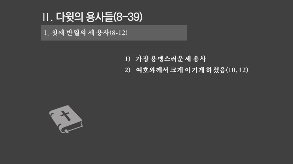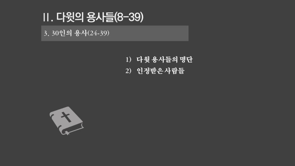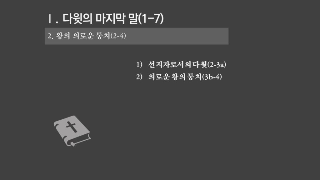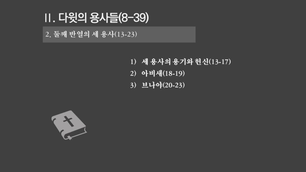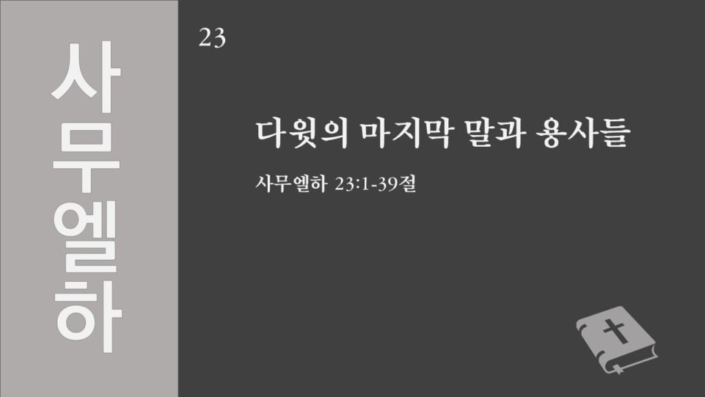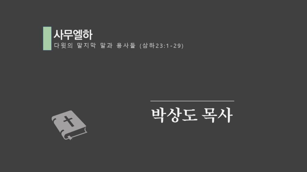 주일설교[사무엘하23] 다윗의 마지막 말과 용사들 제목 : 다윗의 마지막 말과 용사들 성경 : 사무엘하 23장 1-39절 설교 : 박상도 목사 https://sheffieldkoreanchurch.org/wps/wp-content/uploads/2021/10/211024_sermon.mp3 PrevPrevious[사무엘하22] 다윗의 찬양 Next[사무엘하24] 인구조사와 재앙 그리고 회개Next연관설교 [사무엘하24] 인구조사와 재앙 그리고 회개 31/10/2021 [사무엘하22] 다윗의 찬양 24/10/2021 [사무엘하21] 그 후에야 기도를 들으시니라 03/10/2021 [사무엘하20] 세바의 반란 26/09/2021 [사무엘하19] 다윗 왕의 귀환 12/09/2021
