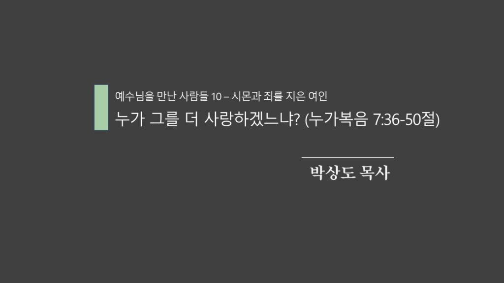 주일설교[예수님이 만난 사람들 10] 누가 그를 더 사랑하겠느냐? 제목 : 누가 그를 더 사랑하겠느냐? 성경 : 누가복음 7:36-50절 설교 : 박상도 목사 https://sheffieldkoreanchurch.org/wps/wp-content/uploads/2022/09/220918_sermon.mp3 예수님 PrevPrevious[예수님이 만난 사람들 09] 권세에 복종하는 믿음 Next[예수님이 만난 사람들 11] 주님을 따르는 삶Next연관설교 내 인생에 게임 오버는 없다. 05/04/2026 당신의 내비게이션은 ‘십자가’를 가리키고 있나요? 29/03/2026 [대림절] 기다림의 기쁨 – 성령의 위로와 은혜 15/12/2024 [예수님이 만난 사람들19] 오늘 네가 나와 함께 낙원에 있으리라 26/02/2023 [예수님이 만난 사람들18] 자기희생의 아름다움 12/02/2023