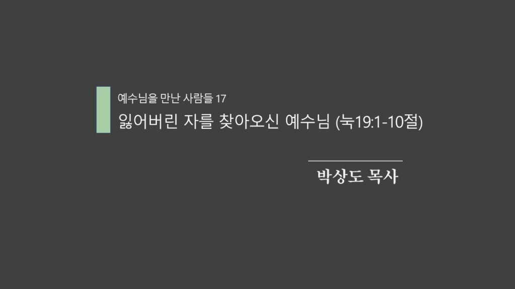 주일설교[예수님이 만난 사람들17] 잃어버린 자를 찾아오신 예수님 제목 : 잃어버린 자를 찾아오신 예수님성경 : 누가복음 19:1-10절설교 : 박상도 목사 https://sheffieldkoreanchurch.org/wps/wp-content/uploads/2023/02/230205_sermon.mp3 PrevPrevious[예수님이 만난 사람들 16] 장애물을 제거하라 Next[예수님이 만난 사람들18] 자기희생의 아름다움Next연관설교 내 인생에 게임 오버는 없다. 05/04/2026 당신의 내비게이션은 ‘십자가’를 가리키고 있나요? 29/03/2026 [대림절] 기다림의 기쁨 – 성령의 위로와 은혜 15/12/2024 [예수님이 만난 사람들19] 오늘 네가 나와 함께 낙원에 있으리라 26/02/2023 [예수님이 만난 사람들18] 자기희생의 아름다움 12/02/2023